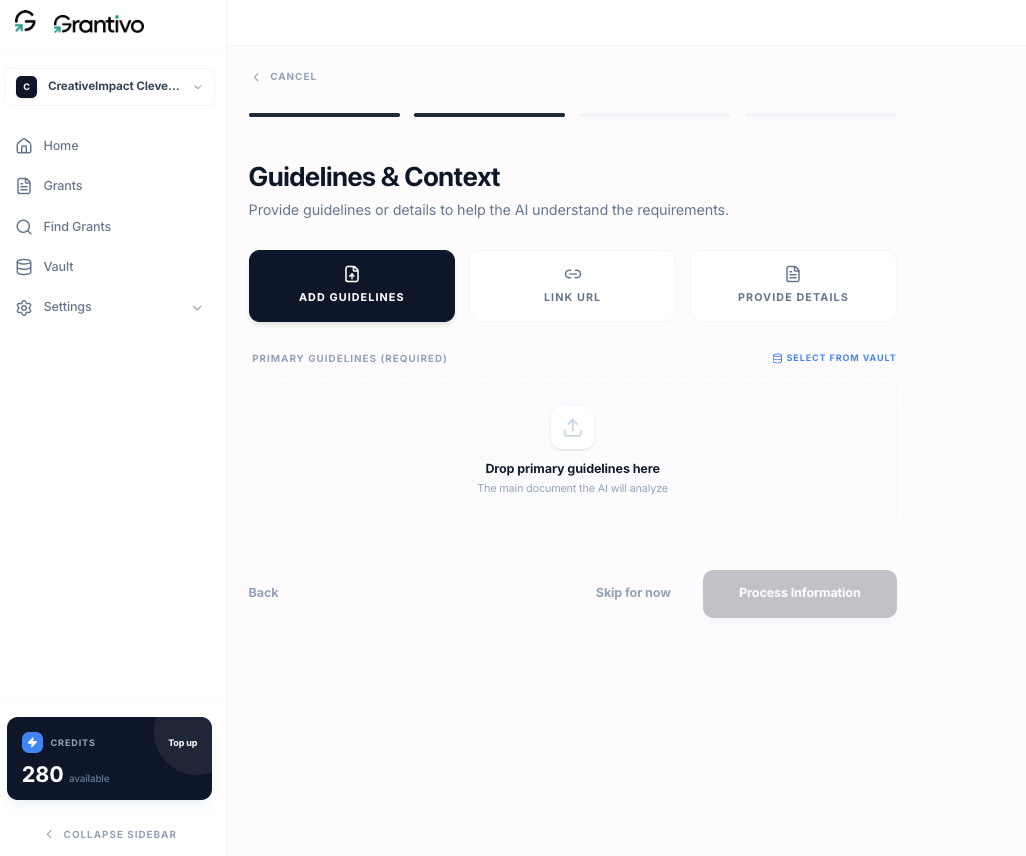 Context: add the RFP or guidelines so Grantivo can analyze requirements and give you funder-aware feedback. You can upload RFP (PDF or DOCX, recommended; Grantivo extracts requirements and structure), paste text or a URL to the guidelines, attach from Vault to reuse a document you've already uploaded, or skip and add context later.